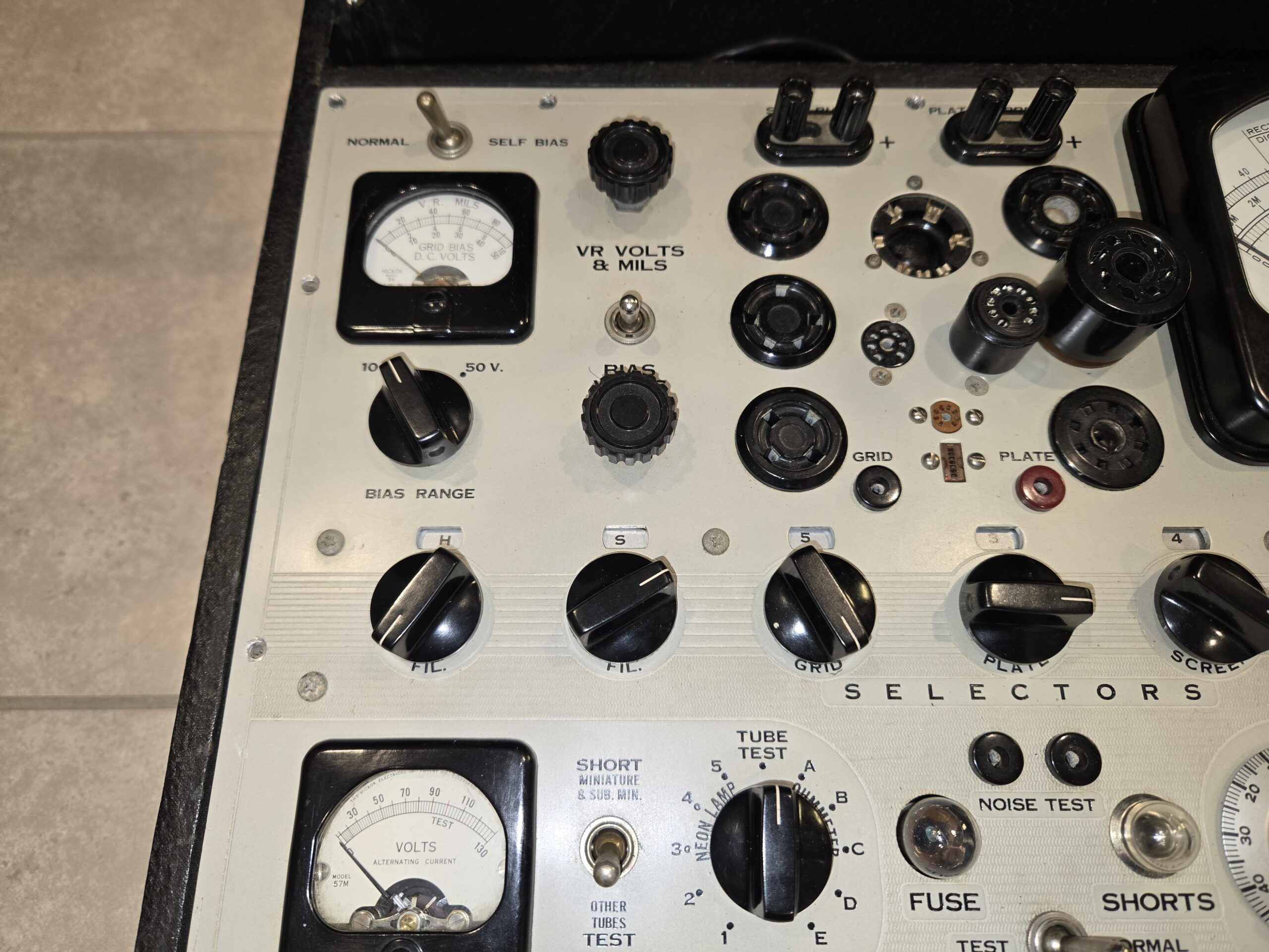 There are NASA and “Government Property” stickers on the deck. I lightly cleaned and restored the case and it is in exceptional condition. There are a few scuffs as you’d expect on a tube tester of this age.